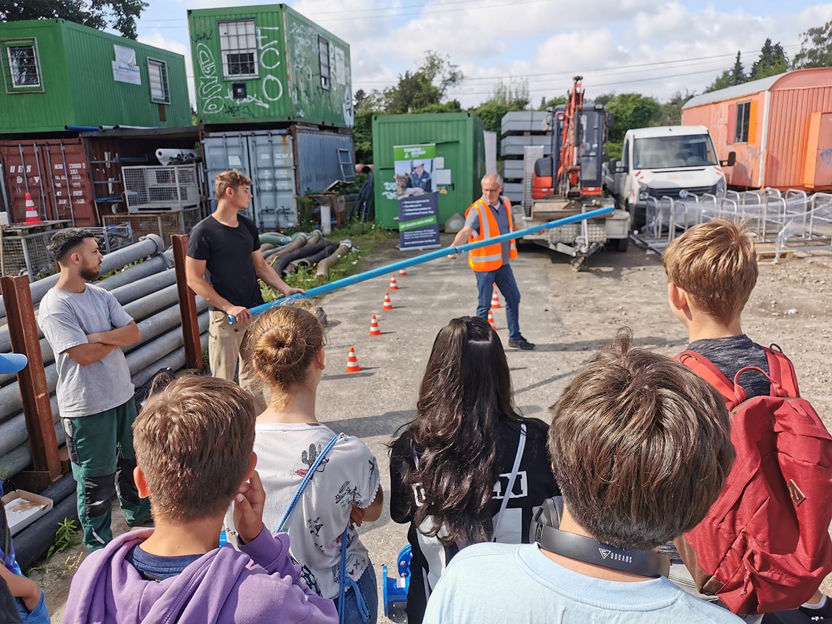 Wie aber gelingt es das Interesse junger Menschen zu wecken und sie für neue Ansätze zu gewinnen? Der Schnupperparkour mit zahlreichen Stationen zum Anpacken und Selbermachen war genau der richtige Ansatz. Unter der fachmännischen Anleitung junger Azubis versuchten sich die jungen Gäste am Verlegen von Pflastersteinen und dem Zusammensetzen von Röhrenstücken.