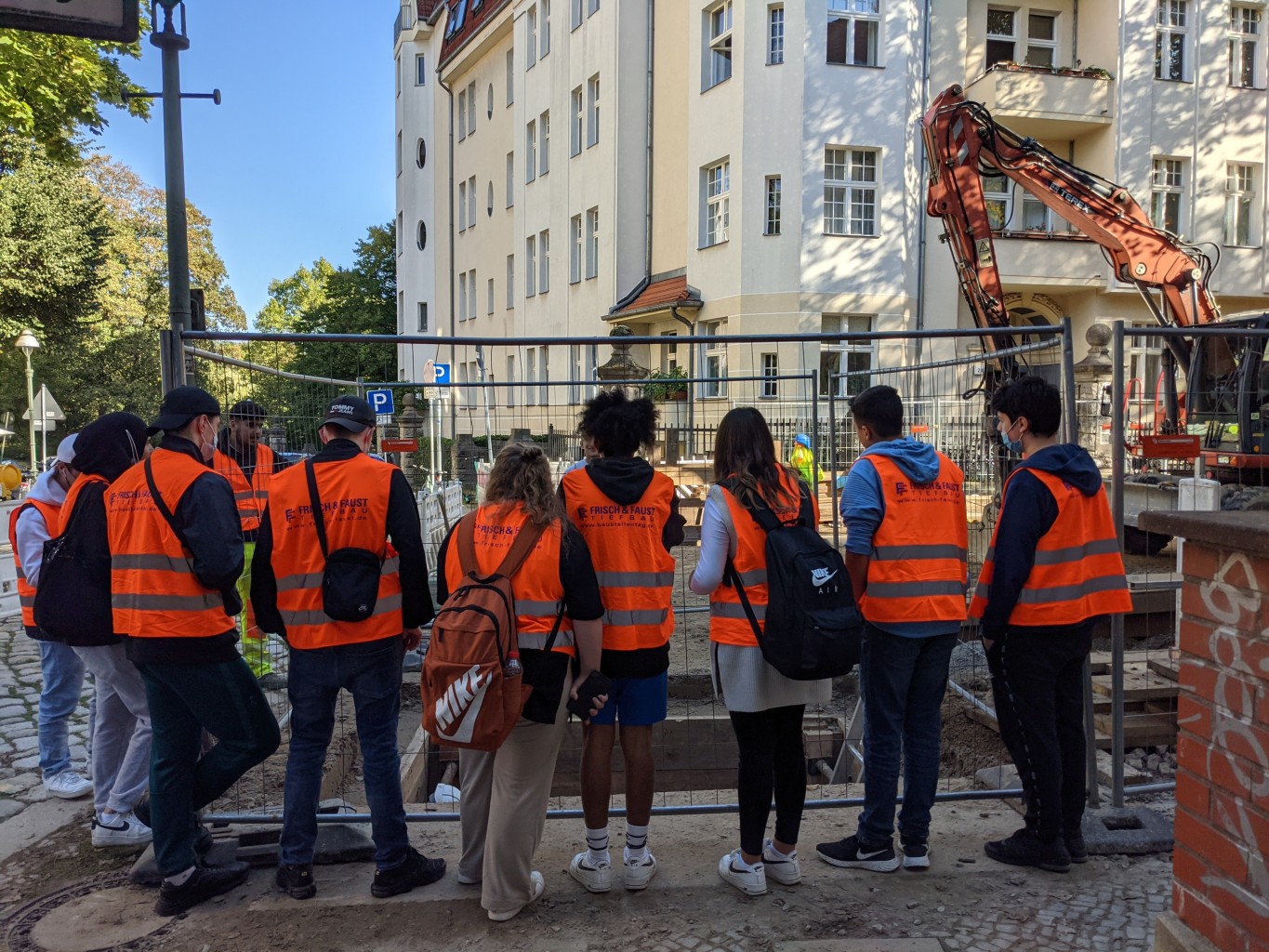 Nachdem der Baustellentag von Frisch und Faust im vergangenen Jahr schon ein voller Erfolg war, wurde er auch in diesem Jahr mit Spannung erwartet. So wurde interessierten Schülerinnen und Schülern einen Einblick in die Ausbildungsberufe Tiefbaufacharbeiter*in, Rohrleitungs- und Kanalbauer*in sowie Fachkraft für Rohr-, Kanal- und Industrieservice gewährt. Auch die Mitarbeiter*innen von jobentdecker und Schule-Betriebe-interaktiv waren mit Schüler*innen der Albrecht-von-Graefe-Schule sowie Jugendlichen des Kooperationspartners „Anschluss plus“ mit dabei. Ziel waren verschiedene Baustellen im Bezirk Tempelhof rund um den Bosepark.