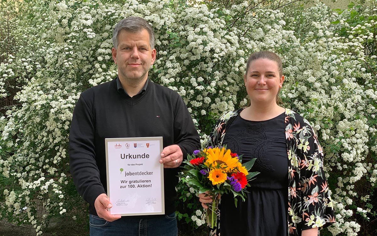 Bezirksstadtrat Andy Hehmke würdigte den tollen Projekterfolg der jobentdecker und gratulierte Projektleiterin Eva-Maria Lehmann persönlich vor der Geschäftsstelle des Friedrichshain-Kreuzberger Unternehmervereins.