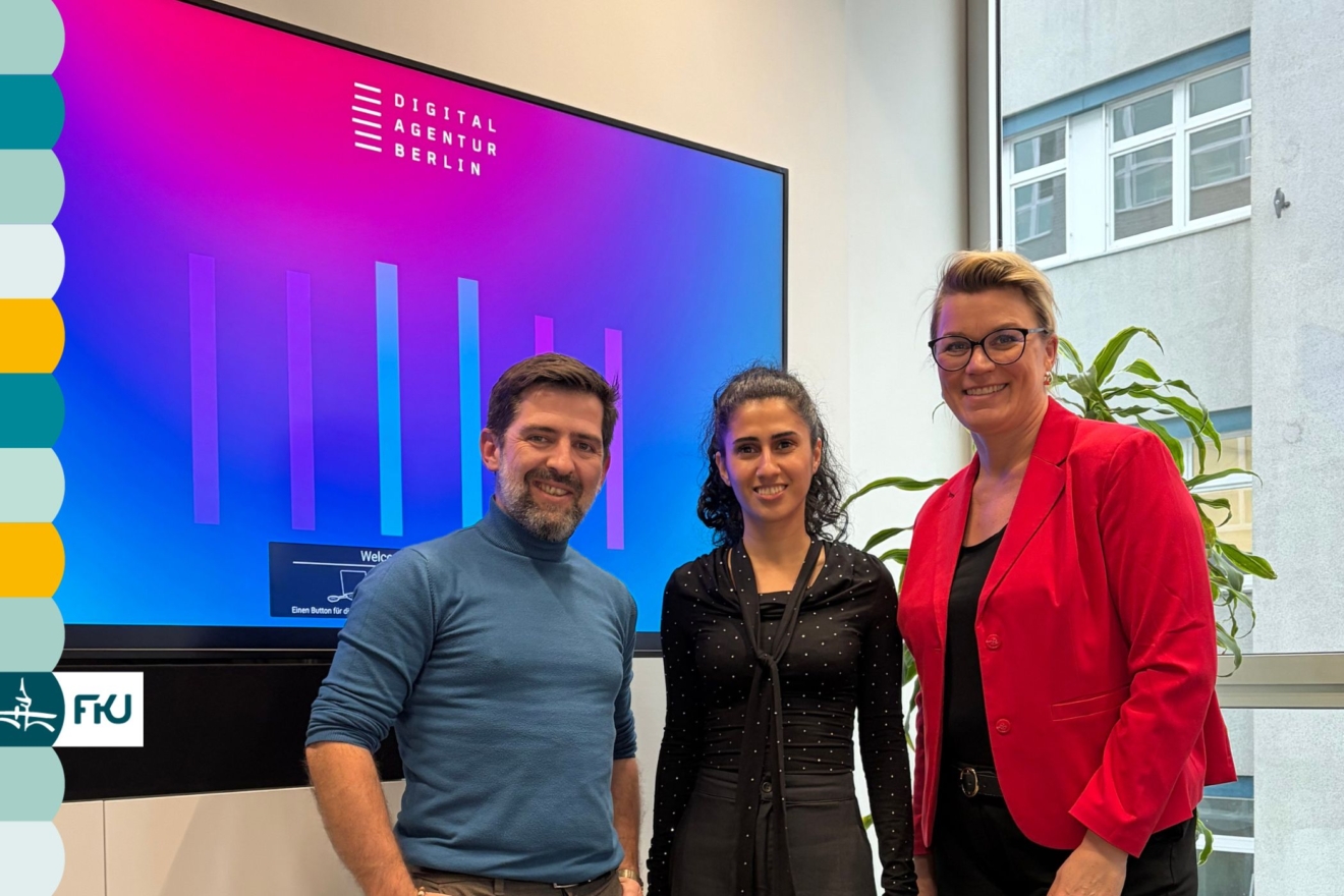 Um die nächsten Schritte dieser erfolgreichen Kooperation zu planen, trafen sich Nicole Voigt (Geschäftsführerin der Digitalagentur Berlin), Aylin Citak (Teamleiterin Netzwerk- und Kund:innenmanagement) und Martin Knauft (FKU Berlin) zu einem gemeinsamen Austausch. Im Fokus standen Fragen wie: Welche Formate sind künftig relevant? Welche neuen Ansätze können entwickelt werden? Und wie lässt sich die Zusammenarbeit weiter ausbauen?