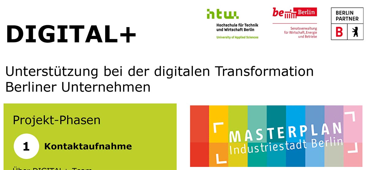 DIGITAL+ der Hochschule für Technik und Wirtschaft Berlin begleitet insbesondere kleine und mittelständische Berliner Unternehmen bei ihrem Schritt in die Digitalisierung, um nachhaltig wettbewerbsfähig zu bleiben und neue digitale Konzepte und Geschäftsmodelle zu erschließen. Bei einem zweistündigen kostenfreien Workshop mit jedem Unternehmen untersucht das Team um Projektleiter Prof. Dr. Stefan Wittenberg das Geschäftsmodell auf Digitalisierungsmöglichkeiten.