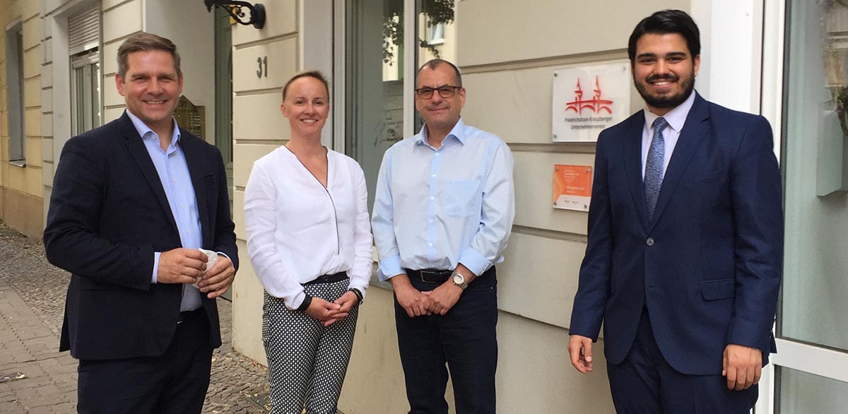 Helene Anders, Anders & Xaver Rechtsanwälte GbR und Rolf Hempel, BEITRAINING Berlin-Mitte, beide Vorstandsmitglieder des Friedrichshain-Kreuzberger Unternehmervereins, begrüßten in der FKU-Geschäftsstelle Kevin Kratzsch, Bundestagskandidat der CDU im Wahlkreis Berlin-Friedrichshain – Kreuzberg – Prenzlauer Berg Ost und Tolga Inci von der Türkisch Deutsche Unternehmervereinigung Berlin Brandenburg e.V. (TDU). Ziel des Treffens war ein gemeinsamer Austausch zu aktuellen Wirtschaftsthemen.