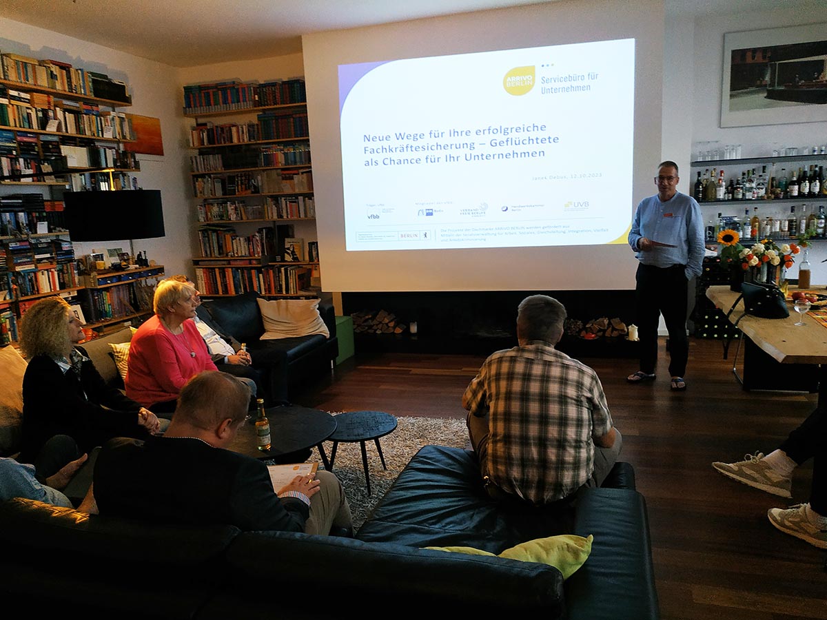 Als Referent führte Janek Debus vom ARRIVO BERLIN Servicebüro durch die Veranstaltung. Er sorgte mit seiner eloquenten Ausdrucksweise für einen aufschlussreichen Abend und beantwortete kompetent die zahlreichen Fragen der Teilnehmenden. Er betonte, dass ein Großteil der Geflüchteten äußerst motiviert ist, Arbeit zu finden, um sich in Deutschland eine Zukunft aufzubauen. Die große Herausforderung liegt oft vor allem in der deutschen Sprache.