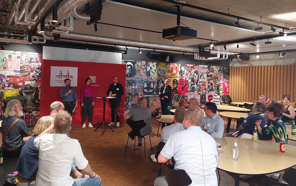 FKU-Vorstandsmitglied Frank Hüpperling begrüßte gemeinsam mit Sven Krüger, adesso SE rund 50Wirtschaftsakteur*innen und FKU-Mitglieder aus der Region. Andy Hehmke, Stadtrat für Schule, Sport und Facility Management, war als thematischer Bühnengast ebenfalls dabei. Wer schon etwas länger im FKU-Netzwerk dabei ist, kennt ihn in seiner vorherigen Funktion als Wirtschaftsstadtrat – 26 FKU-Stammtische hat er hier miteröffnet.