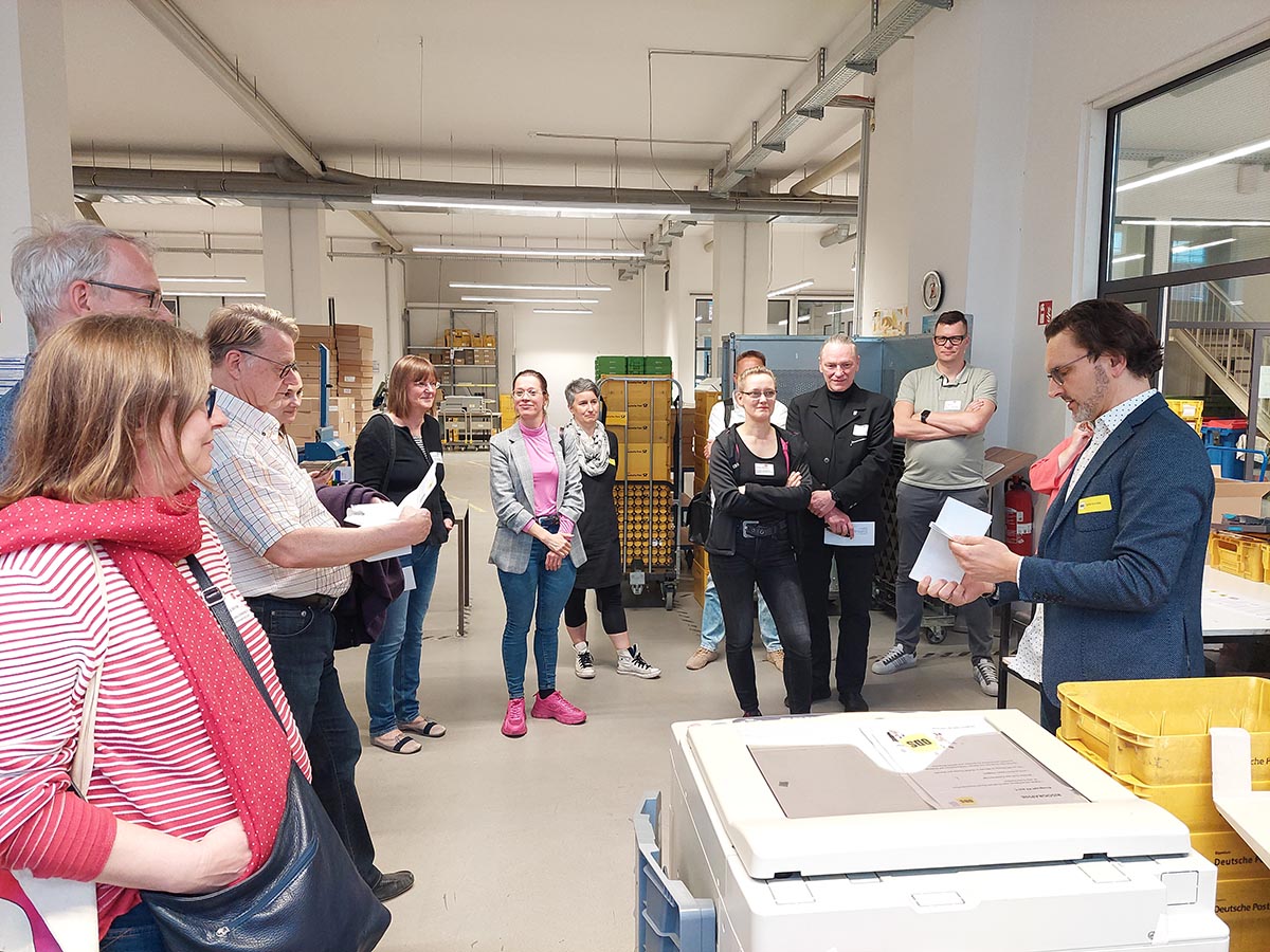 Höhepunkt der Tour durch die Produktionshallen stellte für die Teilnehmende die maschinelle Kuvertiermaschine dar. Dort wurde den interessierten Gästen gezeigt, wie schnell und mit welcher Präzession Briefe eingetütet werden. Der Gastgeber verteilte im Anschluss die Briefe – sie waren sogar personalisiert!