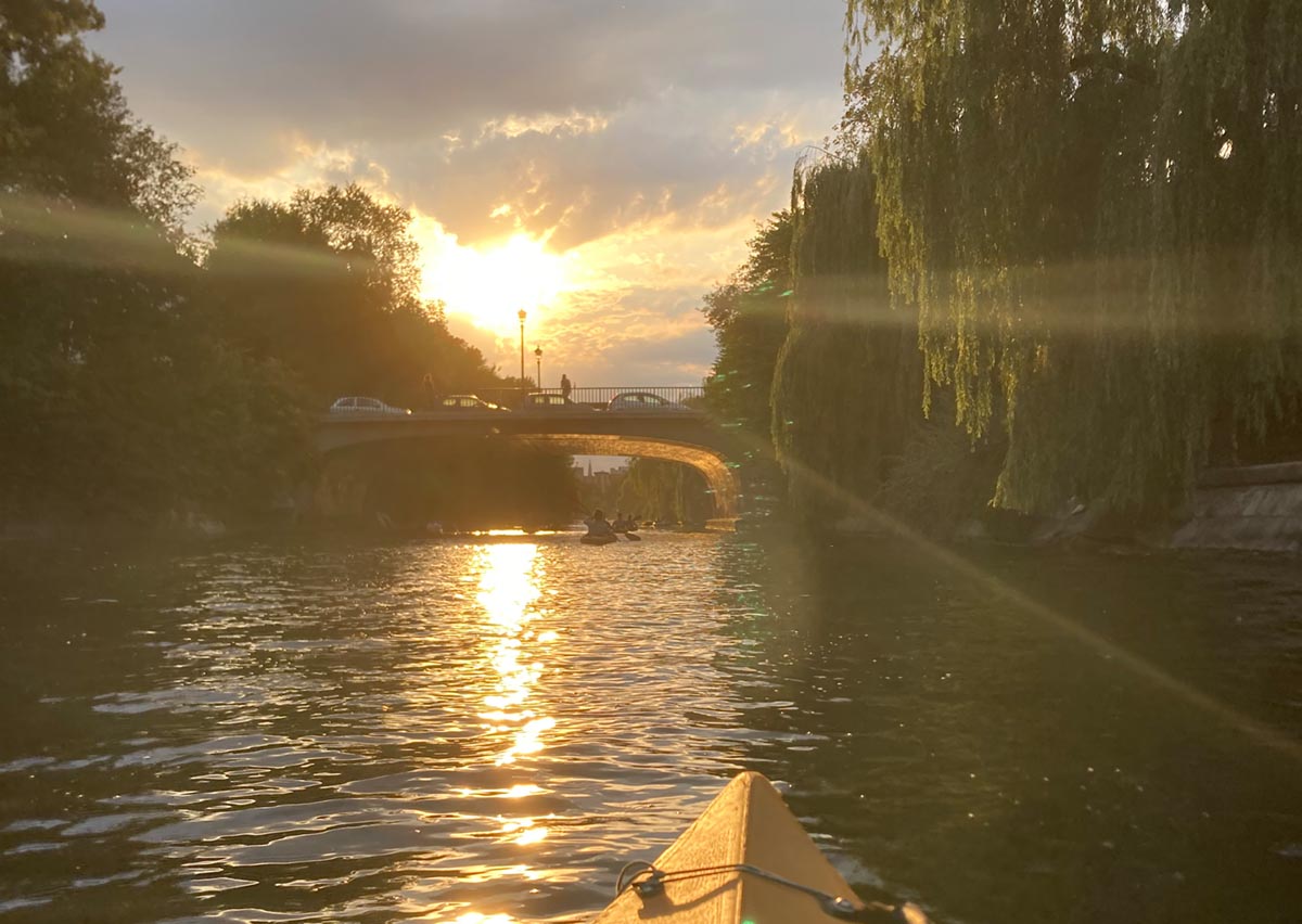 Das eigentlich faszinierende an dieser Kajaktour war aber die wundervolle Abendstimmung im und am Kanal. Menschen, die in Friedrichshain-Kreuzberg leben und an der gesamten Strecke an den Ufern saßen, um entspannt ihren Feierabend zu genießen. Diese Stimmung übertrug sich auch auf die Paddlerinnen. Auf der sehr gemütlichen Rückfahrt westwärts dem Sonnenuntergang entgegen waren sich alle einig: es war eine gelungene Tour.