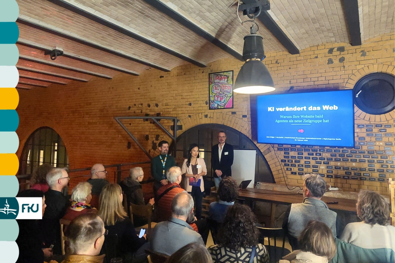 Unter dem Titel „Von Google zu KI: Die neue Ära der Sichtbarkeit“ zeigte FKU-Mitglied Arne Krüger, Geschäftsführer von mtc.berlin und Entwickler von GEOAud.it, wie stark sich das Suchverhalten bereits verändert hat. Ein wachsender Teil des Suchtraffics läuft über KI-Agenten, klassische Klicks über Suchmaschinen gehen zurück, und immer mehr Kaufentscheidungen werden von Chatbots vorbereitet oder direkt beeinflusst. Für Unternehmen bedeutet das: Sichtbarkeit entsteht nicht mehr nur durch SEO und Social Media, sondern durch die Frage, ob und wie KI-Systeme die eigene Website erfassen, einordnen und empfehlen.
